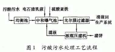 污酸污水處理工藝流程如圖1。來自冶煉系統和制酸系統的污酸污水引人均衡池混合;混合后,污酸污水由泵輸送到中和曝氣池,達到一定液位后,向中和曝氣池內投加、[Ca (O H ),」為20%左右的電石渣乳液,調整pH值為7.8一8.0,使污酸污水中的氟離子、重金屬離子和部分砷沉淀,再根據污酸污水中砷化物含量投加適量FeS04,同時向混合液中通人壓力為50 kPa左右的空氣進行攪拌并起氧化作用,保證反應充分并促進Fe(OH)2氧化成絮凝效果好的Fe(OH)3膠體,將廢水中的亞砷酸及亞砷酸鹽沉淀;曝氣反應完全后,根據污酸污水中重金屬離子含量的高低,決定是否微調pH值至8.5一9.0 ; 中和曝氣反應后的污酸污水通過戈爾膜過濾器進行固液分離,上部清液達標返回生產系統循環利用,底流經板框壓濾機壓濾,濾渣無害化堆存,濾液返回中和曝氣池。