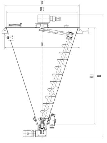 本機(jī)主要由錐型筒體、螺旋軸、公轉(zhuǎn)傳動(dòng)臂、自轉(zhuǎn)轉(zhuǎn)動(dòng)頭及出料閥組成。物料由上部加入。上部減速機(jī)帶動(dòng)公轉(zhuǎn)傳動(dòng)臂使螺旋軸在筒體內(nèi)作公轉(zhuǎn)運(yùn)動(dòng)。下部減速機(jī)帶動(dòng)螺旋軸作自轉(zhuǎn)運(yùn)動(dòng),由于兩軸相交成一定角度,中間使用特制的萬向聯(lián)軸節(jié)傳動(dòng)。